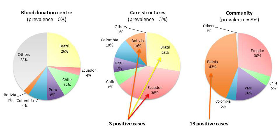 From February 2011 to September 2012, Latin Americans attending the six healthcare centres mentioned above were offered screening for Chagas disease. Screening was first offered to patients attending the DACCM and the PDE. The screening was extended to the two FPC in November 2011 and to pregnant women attending the maternity hospital in January 2012. At the blood donation centre, people were tested from the beginning of the study. In May 2012, screening in the community was proposed by a team composed of a Bolivian pharmacist working as cultural mediator, a medical doctor specialising in tropical diseases, a Bolivian medical doctor and a master’s student in medicine working on the topic. Latin American associative organisations were contacted to assist in choosing events which attracted sufficient numbers of people and to help disseminate the information. A leaflet and poster explaining the transmission, symptoms, clinical course, screening and treatment of Chagas disease in French, Spanish and Portuguese, were developed based on a Spanish leaflet from the “Hospital Universitario Ramón y Cajal” of Madrid. These educational materials helped to spread information about the availability of screening at the different healthcare centres, as well as the management and treatment of positive cases.