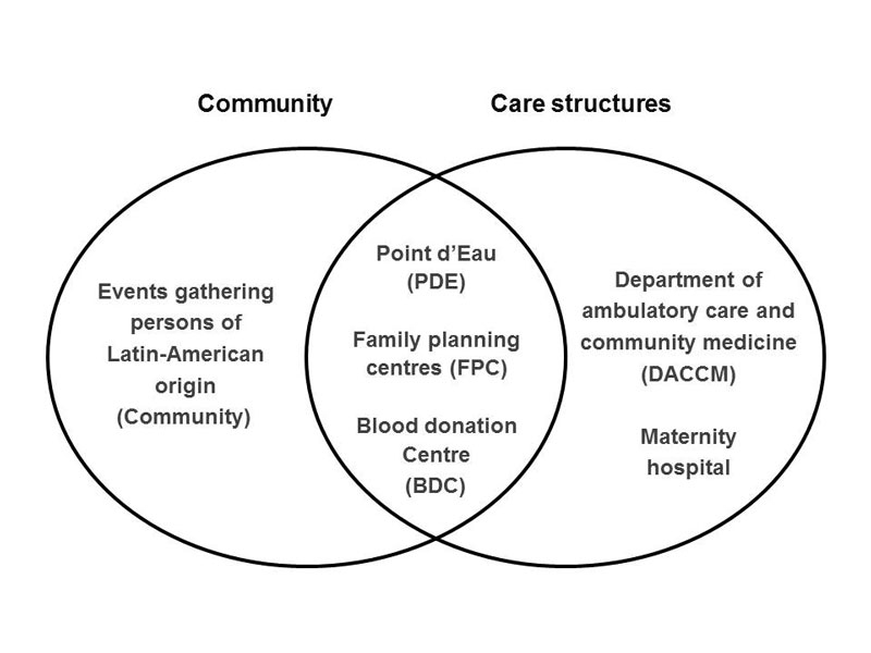 The study took place in six healthcare centres located in Lausanne and the surrounding area. The inclusion criteria were being born (or having spent a considerable part of infancy) in Latin America or having a mother who was born in Latin America (excluding the Caribbean). At the Department of Ambulatory Care and Community Medicine (DACCM), which serves as an outpatient clinic for the University Hospital of Lausanne, the clinician in charge offered a rapid diagnostic test for 20 Swiss francs (22 USD) during routine emergency consultations. At the Point d’Eau (PDE), an urban, low-level healthcare centre attended mainly by undocumented immigrants, the three nurse practitioners offered a rapid test during the usual consultation for 3 Swiss francs. At the maternity hospital, Latin American women attending the obstetric clinic were offered the diagnostic test for 60 Swiss Francs (66 USD). The test was also offered during consultations at two family planning centres (FPC), which provide sexual counselling and related activities, for the price of 22 Swiss francs (24 USD). Systematic screening was implemented at the blood donation centre (BDC), where an additional inclusion criterion was used: having travelled in Latin America for more than one year. Finally, screening was offered free of charge during events (such as cultural celebrations) where people of Latin American origin, Bolivians in particular, gathered (see fig. 1 below).