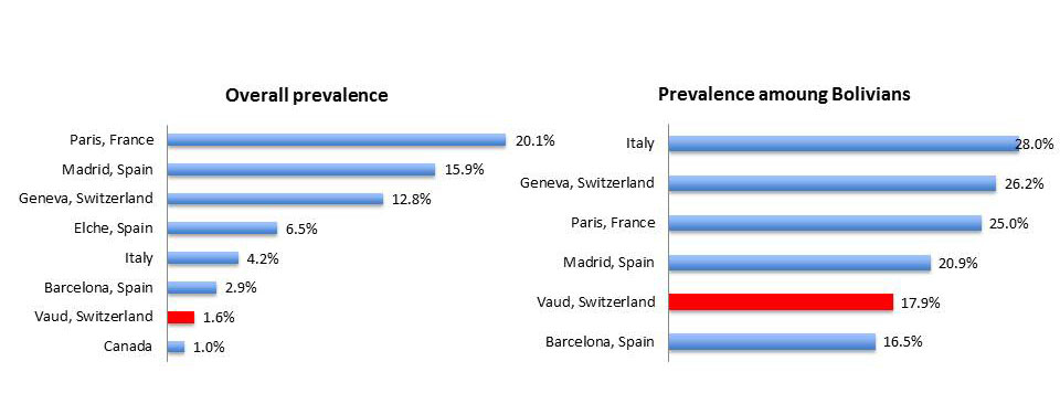In Geneva, the canton to the east of Vaud, 12.8% of the 1,012 Latin American migrants screened were positive for Chagas disease [7]. This high prevalence compared to our study can probably be explained mainly by the high proportion of Bolivians: 48% in Geneva compared to 8% in Vaud. In support of previous studies, we found that the majority of affected people originated from Bolivia. The 17.9% prevalence among Bolivians (or 21.5% if we exclude blood donors) is close to that documented in other studies: Barcelona (16.5%), Madrid (20.9%), Paris (25.0%) and Geneva (26.2%). Excluding the BDC, where testing is compulsory, the number needed to test was low for Bolivians - only four people need to be tested to find a positive case – but high for migrants originating from other countries (130). Special attention should therefore be paid to Bolivians when designing a strategy.