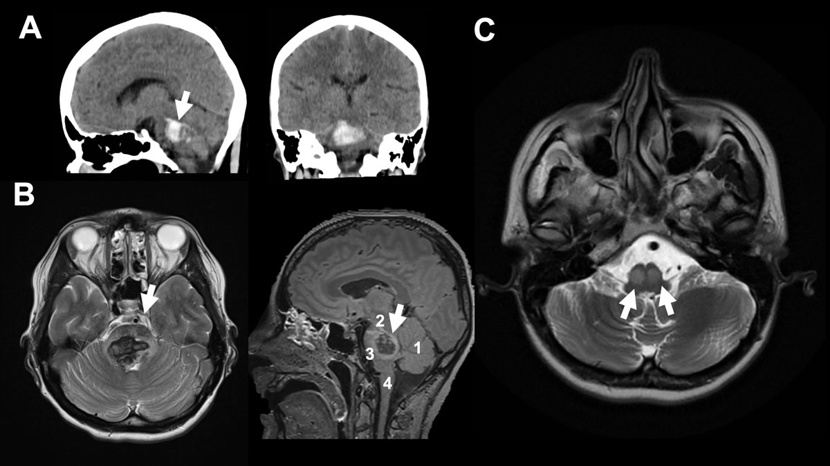 Russell et al. proposed a different approach. They divided brainstem haematomas into three types: central, dorsolateral tegmental and tegmentobasilar [21]. Large haematomas resulting from arterial hypertension generally occupied the central pons, leading to a rapid, fatal clinical course due to the involvement of the reticular system. Partial pontine haematomas, mostly occurring due to the rupture of cryptic vascular malformations, were restricted to the lateral half of the pons, sparing the reticular system. These could be either dorsolateral tegmental or tegmentobasilar.