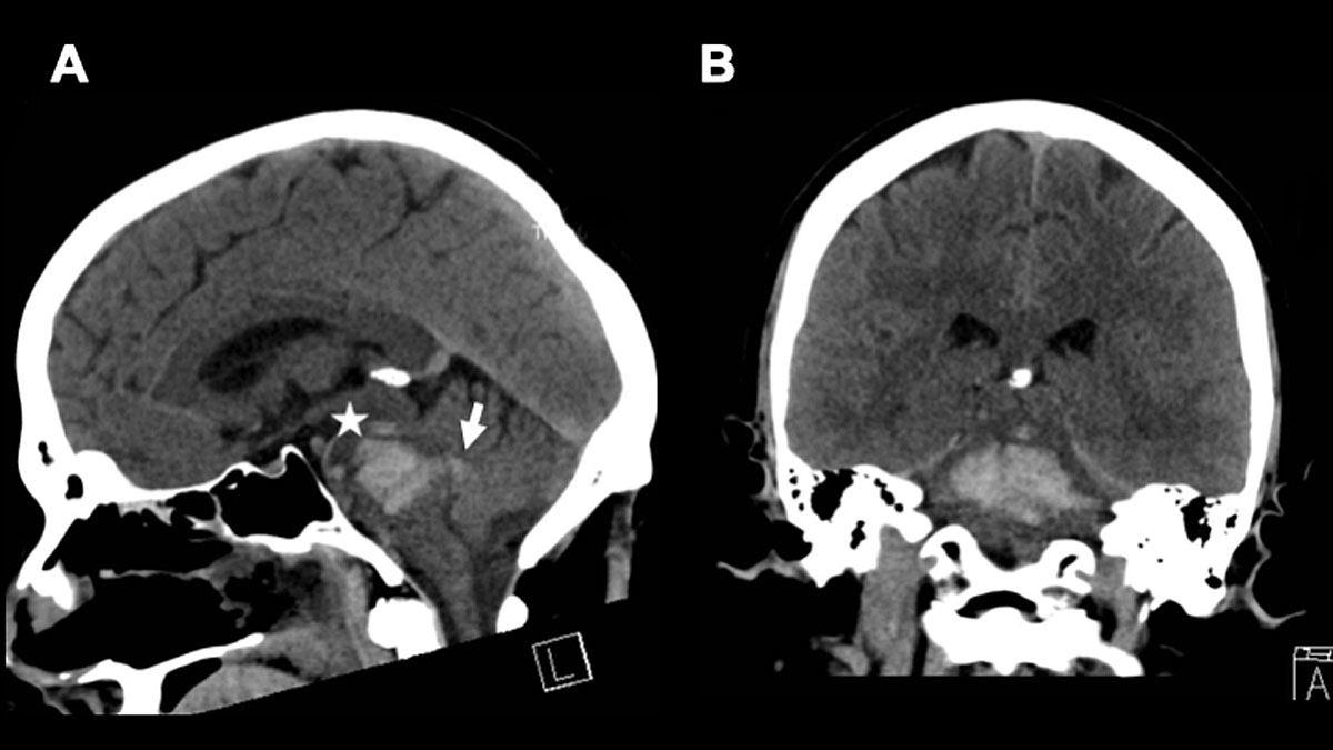 Figure 4 A 47-year-old male patient presented with an initial GSC of 3 at hospital admission. CT diagnostics revealed a “massive” brainstem haemorrhage. Electrophysiology showed highly pathological results (SEP, AEP and EEG). The patient was extubated on day +4 under a palliative care concept. A. shows a sagittal view and B. an axial view of the initial CT scan. * indicates the haemorrhage and → indicates the ventricular extension of the haemorrhage. Ventricular extension may cause hydrocephalus.