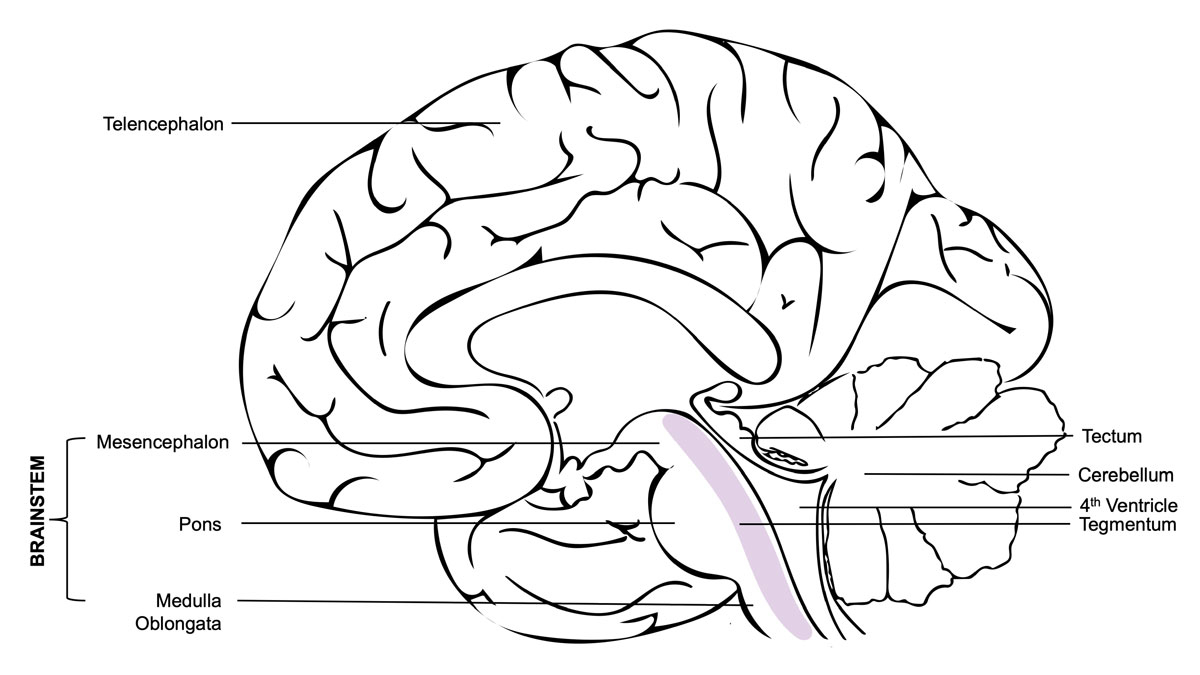 Figure 2 The mesencephalon, pons and medulla oblongata all belong to the functional unit that we call the brainstem. It is situated in the posterior cranial fossa and its ventral surface lies on the clivus. The brainstem is a very compact and dense region packed with cranial nerve nuclei and neurons from the reticular formation. Damage to the brainstem is therefore often life-threatening. Even small lesions can destroy cardiac and respiratory centres, disconnect the forebrain motor areas, or destroy higher centres of consciousness, perception and cognition. The tegmentum (Latin for “covering”) is an anatomical name for the area located between the ventricular system (4th ventricle) and the basal structures of the brainstem. It contains the rostral end of the reticular formation.