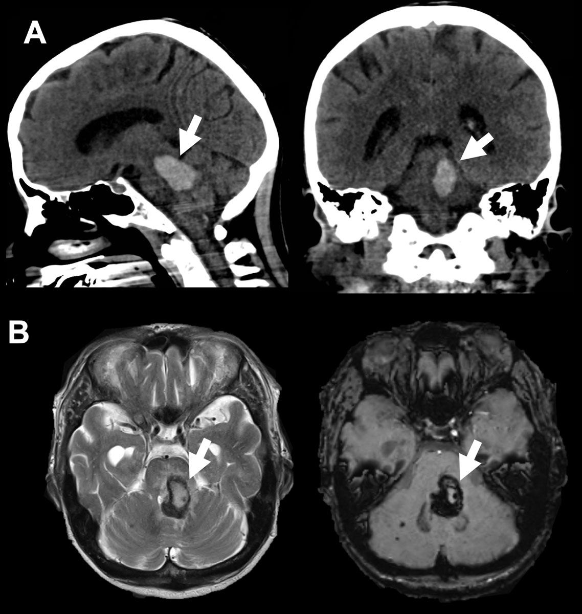 Figure 6 A 66-year-old female patient with Down syndrome presented with fluctuating GCS between 7 and 10 and a “unilateral tegmental” brainstem haemorrhage. Neurological status was no pupil abnormalities and positive left Babinski. Due to neurological deterioration, the patient was intubated right after admission and transferred to the Neurosurgical ICU. Radiologically, no source of bleeding (e.g. vascular malformation) was identified. The patient suffered from known hypertension. Follow-up CT on day +1 showed 5 mm of growth in the haematoma with progressive compression of the fourth ventricle and an enlargement of the ventricular space. An external ventricular drain (EVD) procedure was performed the same day. BAEPs and EEG on day +5 were without pathological findings. After removal of the EVD, the patient again deteriorated neurologically. In conclusion with the radiological findings, a VP-shunt would have been needed long-term. With the perspective of a persistent, severely disabled state of the patient, and taking into account the presumed will of the patient, the family opted for comfort-care, which was initiated on day +18. The patient died on day +19. A. shows a sagittal view and an axial view of the initial CT scan. B shows the initial MRI scan and the extent of the haemorrhage (FLAIR left and SWI right). The Arrow (→) indicates the haemorrhage.