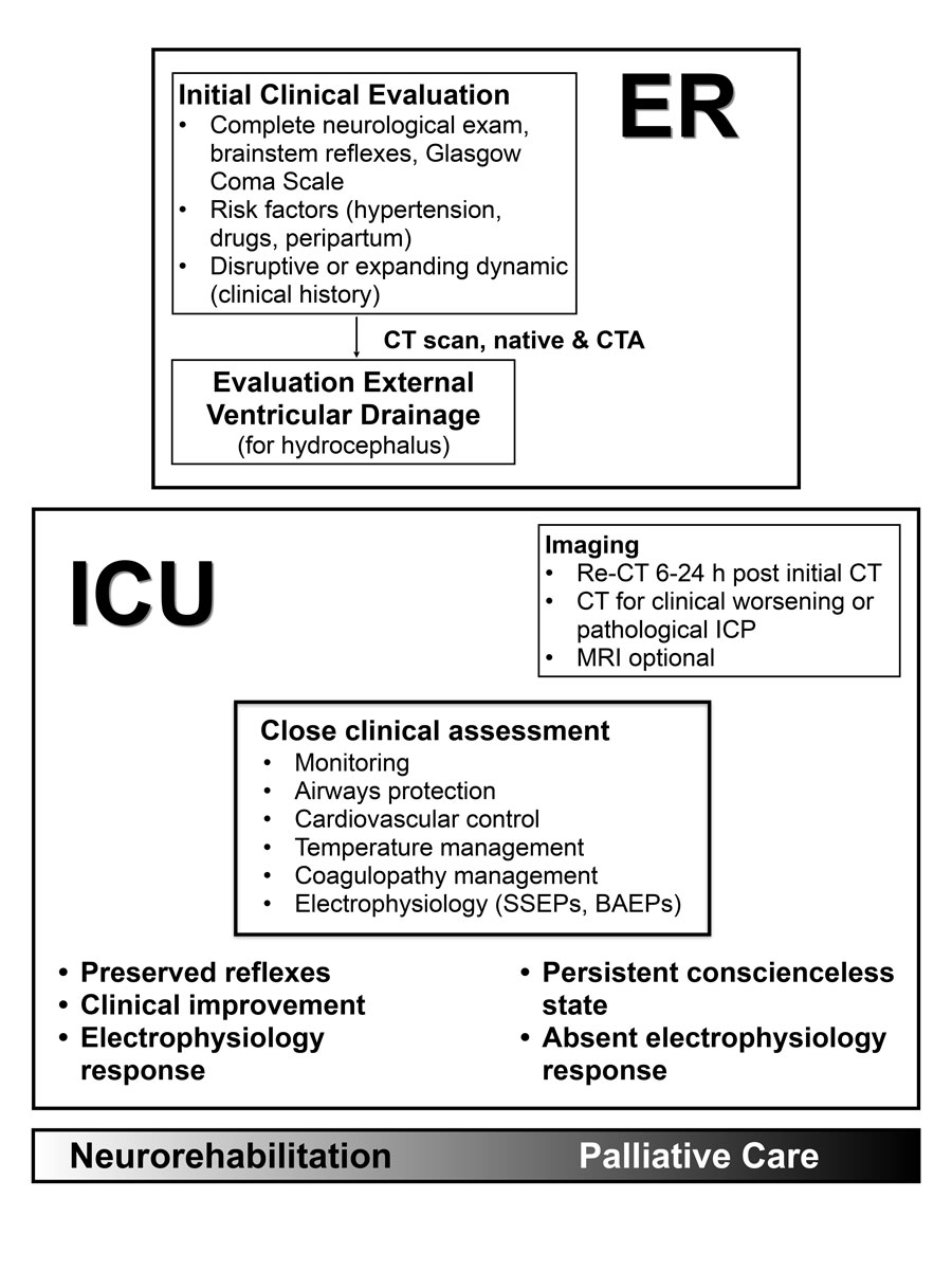 Figure 7 As it is a very heterogeneous disease, clear management guidelines concerning brainstem haemorrhage do not exist. An initial clinical and neuroradiological evaluation must be obtained rapidly in the ER, including thorough neurological exams, the acquisition of the patient’s medical history, risk factors, a cranial CT scan and an angio CT. If there are signs of hydrocephalus, the decision on an EVD must be made after CT. Management should continue in the ICU (Intensive Care Unit) with close clinical assessments, neuroprotective treatment (airway protection, tight control of blood pressure, temperature, glucose and electrolytes, correction of coagulopathy) and electrophysiology. Ultimately, whether to rehabilitate or to initiate palliative care is an individual decision. Clinical assessment and electrophysiological testing can guide the making of this decision.