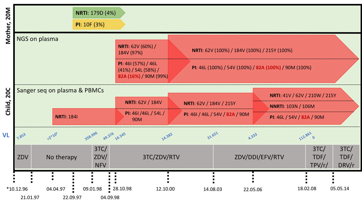 Figure 4 Deep sequencing of samples from mother-child pair 20. Comparison of Sanger sequencing and deep sequencing results of HIV-1 RNA from mother-child pair 20. Sampling dates and treatment history are indicated, as well as HIV-1 loads (copies / mL). Deep sequencing results are additionally shown as mutation frequencies (%). No material was available from the first time point at which the reported M184I was detected.