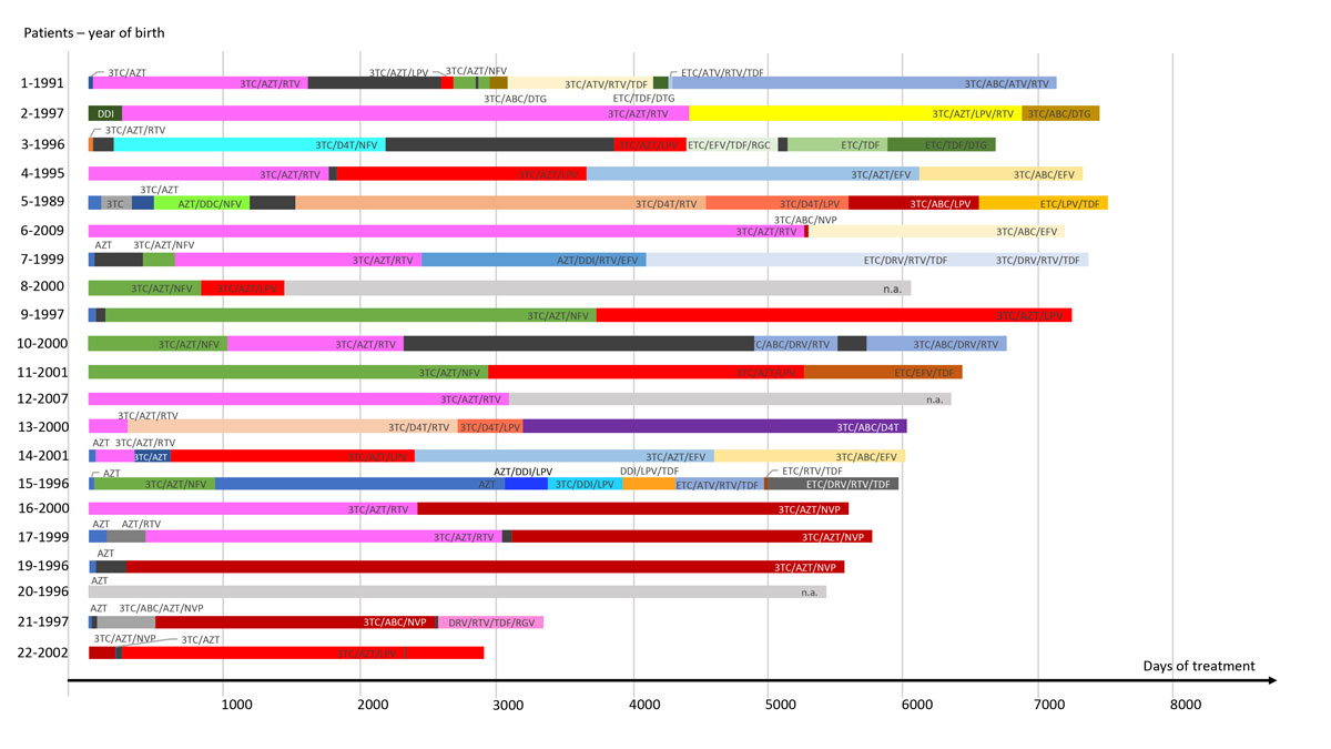 Figure 1 Individual antiretroviral treatment history of vertically HIV-infected children. HIV treatment history over eight years of follow-up is shown. Patients 18 and 21 were analysed by deep sequencing, as described in more detail in the results section, and patient 20 is shown in figure 4. The date of birth is indicated in front of the corresponding time line. Each coloured bar represents a type of treatment. A black bar means no treatment and a grey bar means data not available. Time is represented on the x axis, and the length of a bar corresponds to the interval of treatment, including when it was started.