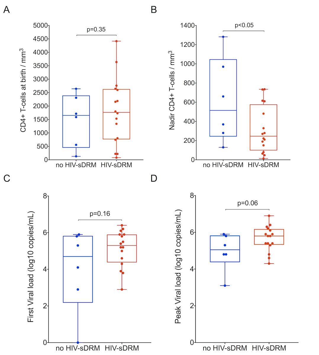 Figure 3 HIV load and CD4 T-cell count in vertically HIV-infected children. A. CD4 T-cell count in MTCT children at birth with and without selected HIV drug resistance mutations (HIV-sDRM). B. Nadir CD4 T-cell count in MTCT children with and without HIV-sDRM. C. First HIV-1 load in MTCT children with and without HIV-sDRM. D. Peak HIV-1 load in MTCT children with and without HIV-sDRM. Box and whiskers plots showing median and 25th and 75th percentiles.