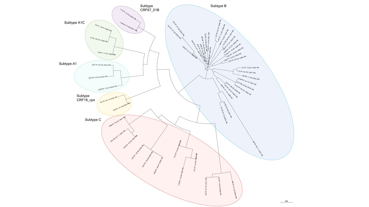 Figure 2 Circular phylogram of mother and child viral RNA and proviral DNA sequences. The diversity and evolution of HIV-1 protease sequences from RNA and proviral DNA over time is shown. Sequences that cluster together due to common origin and subtype are marked in different colours for subtype B, subtype C, subtype CRF18_cpx, subtype A1, subtype A1C, and subtype CRF67_01B.