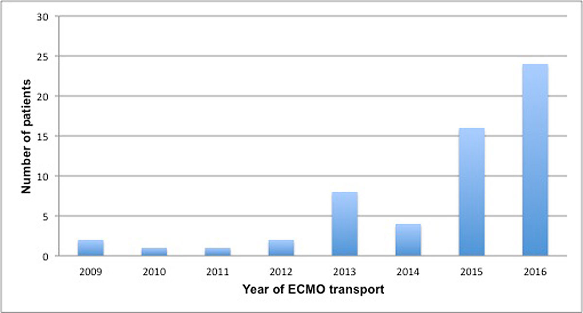 Figure 1 Number of patients on extracorporeal membrane oxygenation (ECMO) transported by year. The graph shows an increase in the number of ECMO transports over the duration of the study, with an exponential increase in 2015 and 2016. One patient was excluded due to international repatriation following ECMO implantation in our institution and two due to incomplete medical records from the years 2009 and 2010.