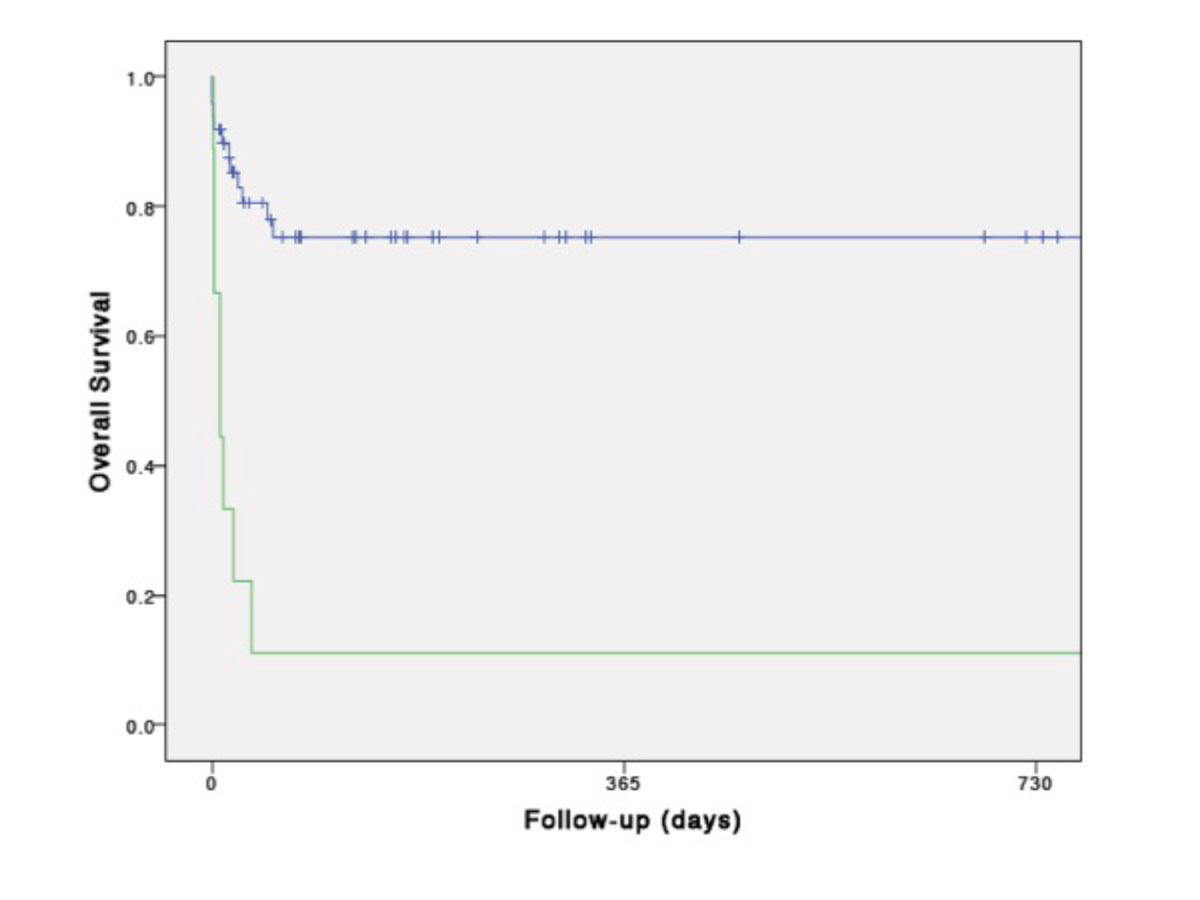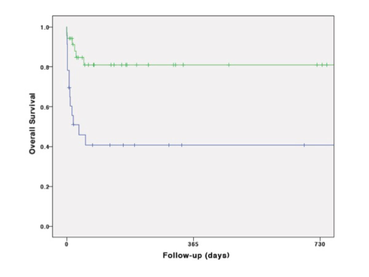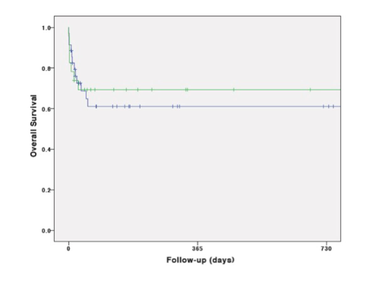 Figure 2E Kaplan-Meier cumulative survival curves grouped by means of transport: blue graph helicopter (n = 35) and green graph ambulance (n = 23). Log-rank (Mantel Cox) test: p = 0.75.