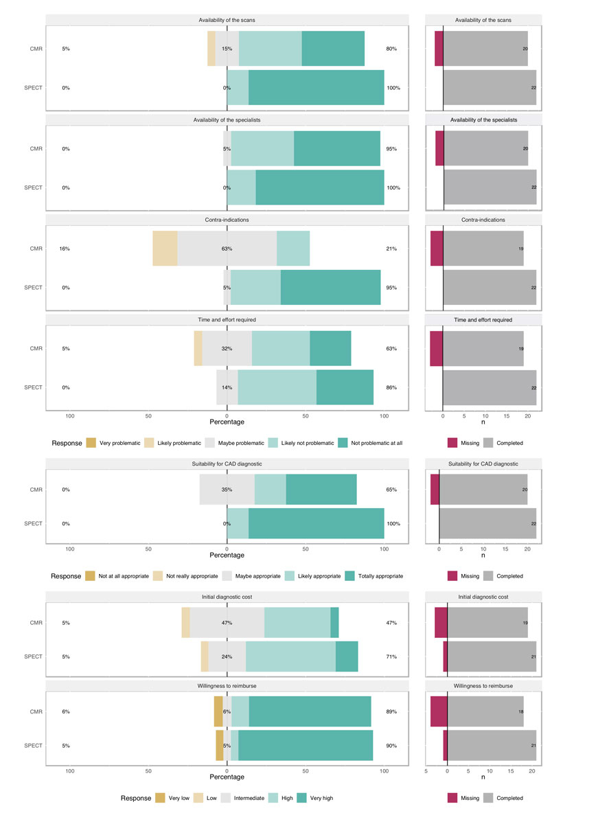 The greatest discrepancy in the answers concerned contraindications to the procedures: Physicians perceived CMR to be have more contraindications, hindering its implementation for the diagnosis of stable CAD. The availability of the SPECT scans and the suitability of SPECT for the diagnosis of CAD were considered better than the equivalent for CMR. The other parameters did not show any significant differences.