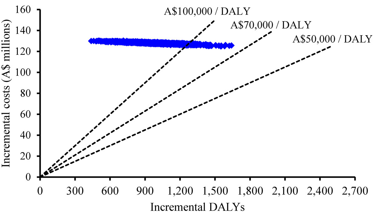 The cost-effectiveness plane is shown in figure 3. The graph shows that the 2000 simulated ICERs ranged from A$76,600 to A$296,790 per DALY averted. The cost-effectiveness acceptability curve (fig. 4) shows the probability that the ICER was lower than a particular willingness-to-pay (WTP) threshold. If a WTP threshold of A$50,000 per DALY averted was used, the probability of trastuzumab being cost effective was zero.