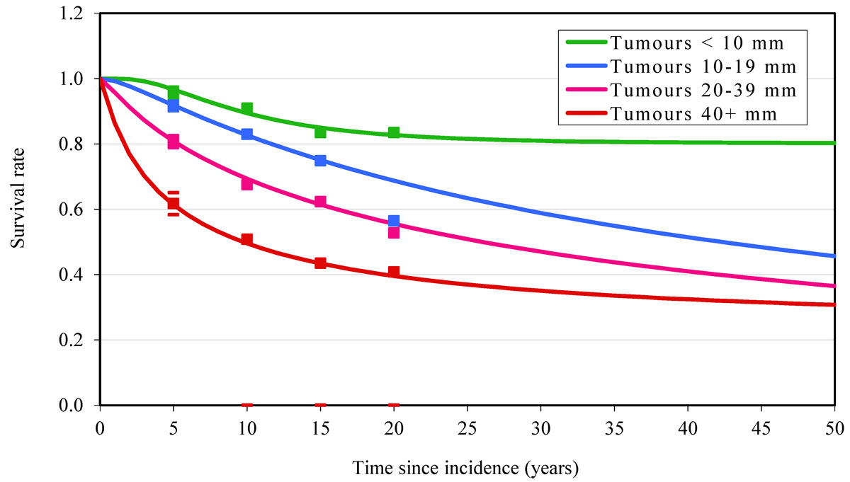 A limitation is that the lognormal curve of survival of tumour sizes 10–19 mm did not fit the data well, causing the modelled survival in this group to drop below the survival of the larger tumour sizes after almost 30 and 45 years of follow-up, respectively. However, the large majority of patients would not be followed-up for so many years, so the effect of this problem is not big.