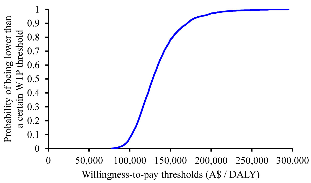 Figure 4 The cost-effectiveness acceptability curve. DALY = disability-adjusted life-year; WTP = willingness-to-pay.