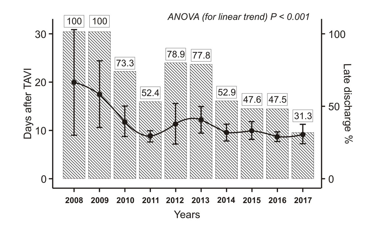 Figure 2 Year by year evolution of the length of hospital stay after TAVI presented in mean values and as percentage of patients discharged 1 week (or later) after the TAVI (late discharge, shaded columns).