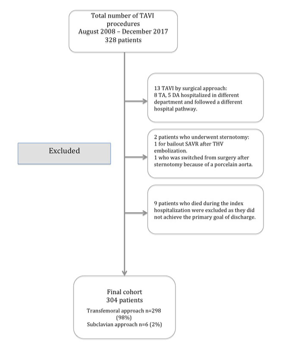 From August 2008 to December 2017, 328 consecutive patients with severe symptomatic aortic valve stenosis underwent implantation of a transcatheter heart valve (THV) at our institution. The study population flow chart showing patients excluded from the final cohort according to the predefined study criteria are presented in summary in figure 1.
