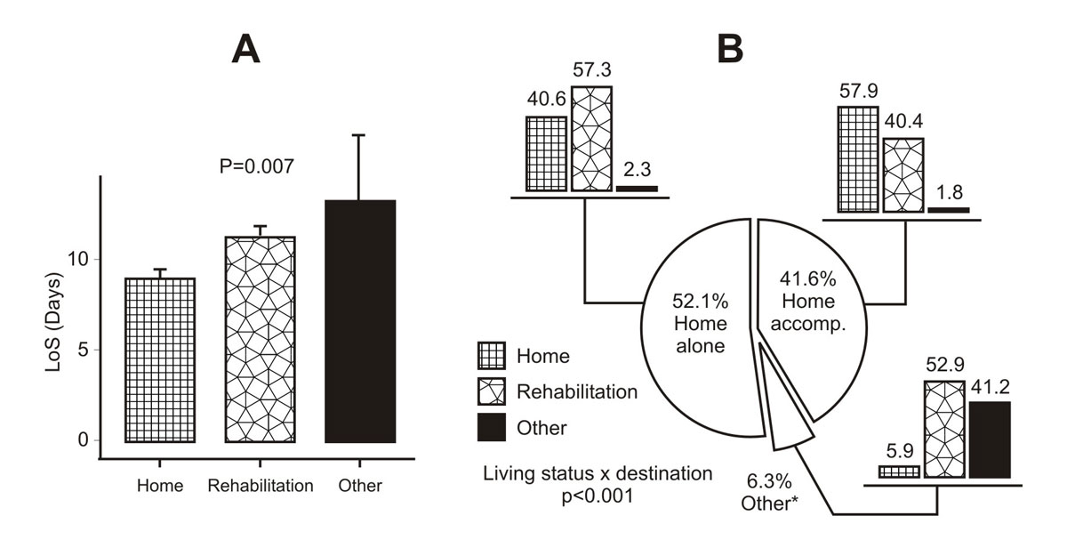 Figure 3 Length of hospital stay and patients’ destination after the intervention (panel A). Patient destination according to the baseline living status after the TAVI (panel B).