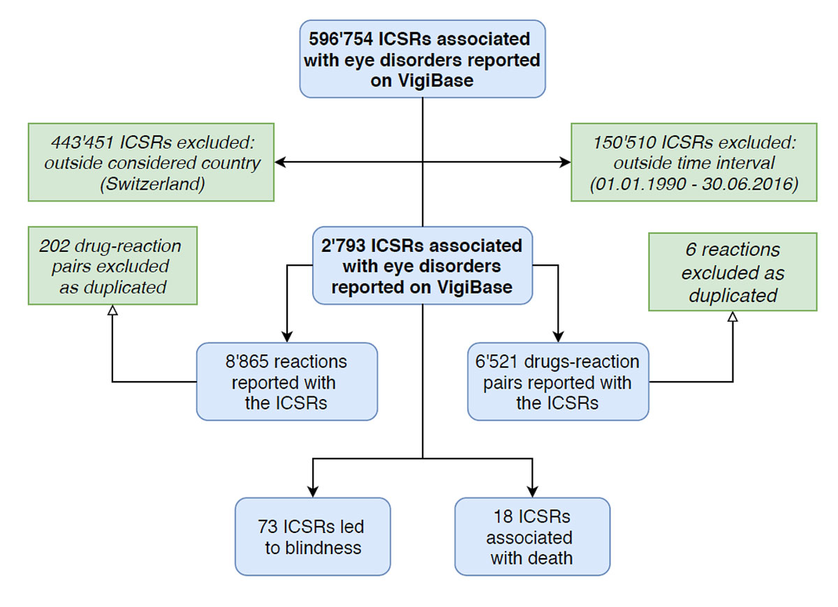 ICSRs associated with eye disorders reported in Switzerland from January 1991 to June 2016 were selected from the WHO VigiBase. Following data adjustment and the removal of duplicates, we obtained 2793 ICSRs corresponding to 6521 drug-reaction pairs (fig. 1). Ocular adverse reactions constituted a small proportion (3.5%) of all ICSRs reported in Switzerland during the period of interest (total number of reports 80,515). Nevertheless, underreporting could be an important limitation of spontaneous reporting systems for ADRs such as the WHO VigiBase, leading to biased data and possibly false conclusions.