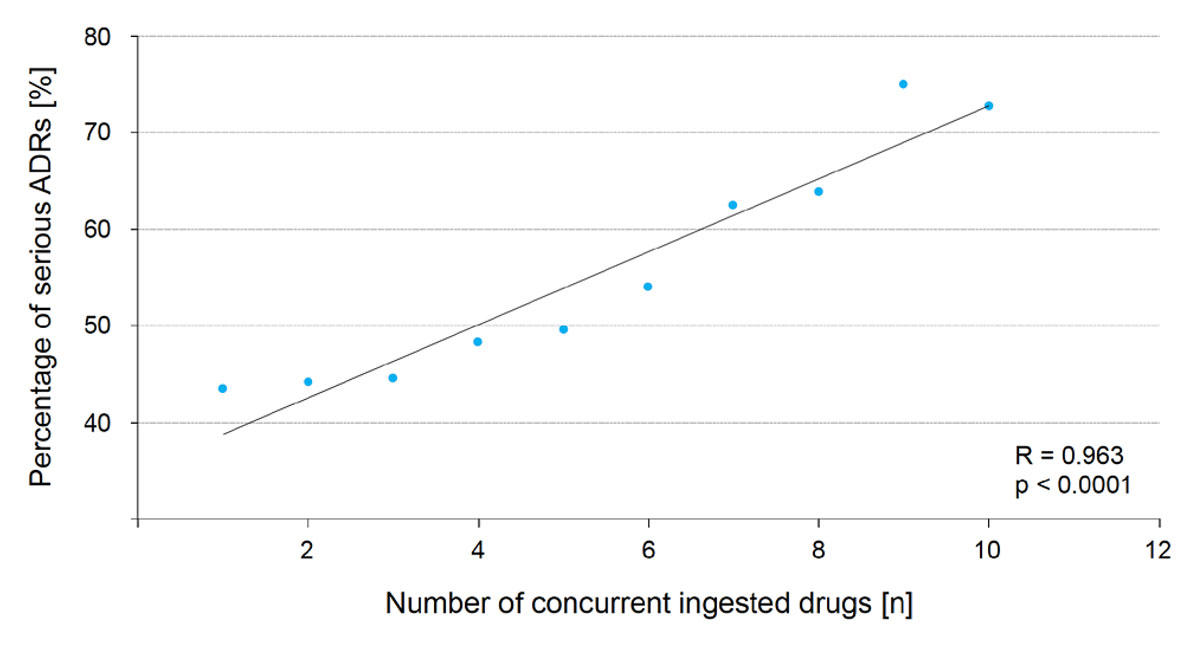 Figure 2 Linear correlation between number of concurrent ingested medications and rate of serious ADRs