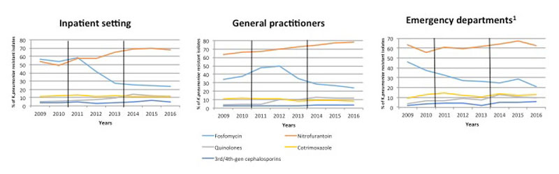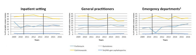 High susceptibility to nitrofurantoin and fosfomycin were consistently observed, with overall annual proportions of resistant isolates <5% and <2% respectively, across all settings. Nevertheless, a significant increase over time was observed for fosfomycin (from 1.1% in 2009 to 1.3% in 2016; p <0.001) while resistance to nitrofurantoin decreased (4.1% in 2009 to 0.8% in 2016; p <0.001). Resistance to quinolones increased from 14.5% in 2009 to 19.3% in 2016 (p <0.001). Resistance to cotrimoxazole decreased from 23.0% in 2009 to 21.3% in 2016 (p <0.001) but always remained >20%. E. coli resistant to 3rd/4th-generation cephalosporins increased in all settings, from 2.9% in 2009 to 5.3% in 2016 (p <0.001).