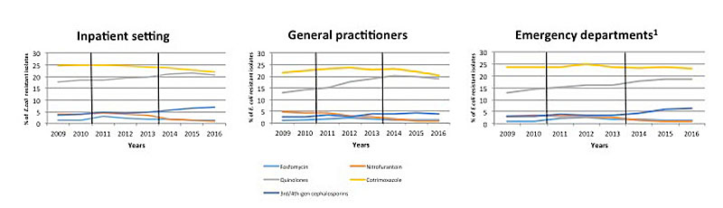 Figure 1 Proportion of resistant E. coli isolates from urine samples collected from inpatients and outpatients between 2009 and 2016 in Switzerland. Data were provided by ANRESIS, the national laboratory-based antimicrobial resistance surveillance system. Vertical black lines indicate the time period of the switch from CLSI to EUCAST breakpoints.