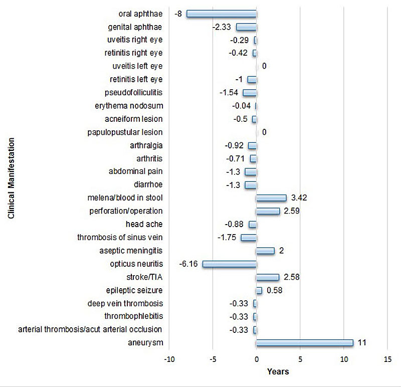 The interval between occurrence of a given organ manifestation and diagnosis of Behçet’s syndrome varied between −8 and +11 years (fig. 2). Whereas oral aphthae preceded diagnosis of Behçet’s syndrome for up to 8 years, vessel or central nervous affection occurred up to 11 years after diagnosis of Behçet’s syndrome.