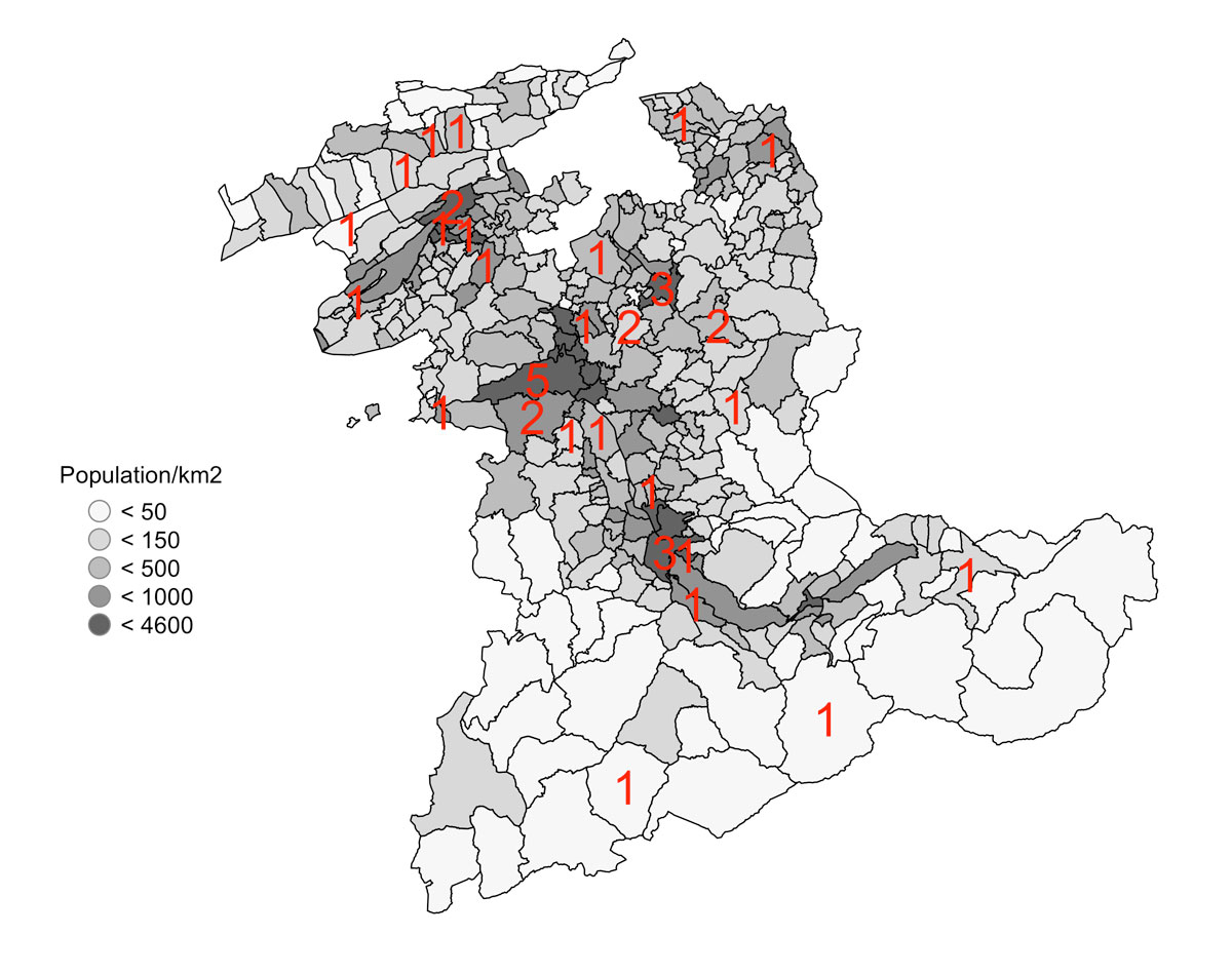 Figure 1b Communities of the Canton of Bern and their populations per km2 (grey), with the number of patients with Behçet’s syndrome per community in red.