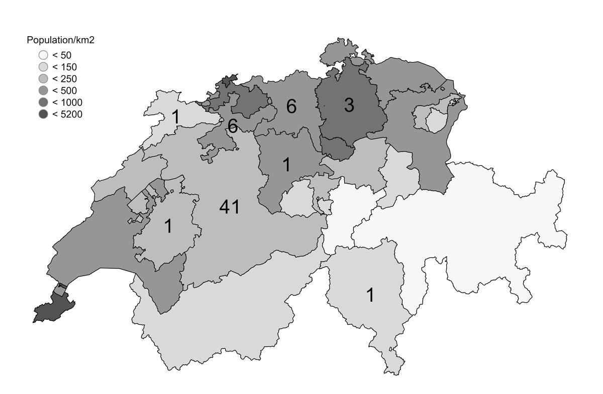 Figure 1a Cantons of Switzerland and their populations per km2 (grey), with the number of patients with Behçet’s syndrome per canton.