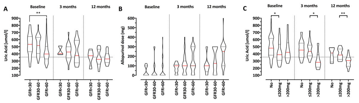 Figure 2 Renal function, SUA levels and allopurinol dosage at baseline and follow-up. Violin plots (red lines = medians) of (A) Glomerular filtration rate (GFR in ml/min/1.73 m2) and corresponding SUA (serum uric acid) levels in μmol/l, (B) GFR and corresponding allopurinol dosages (mg/d), (C) Allopurinol dosages and corresponding SUA levels for the 3 time-points of the observation period.