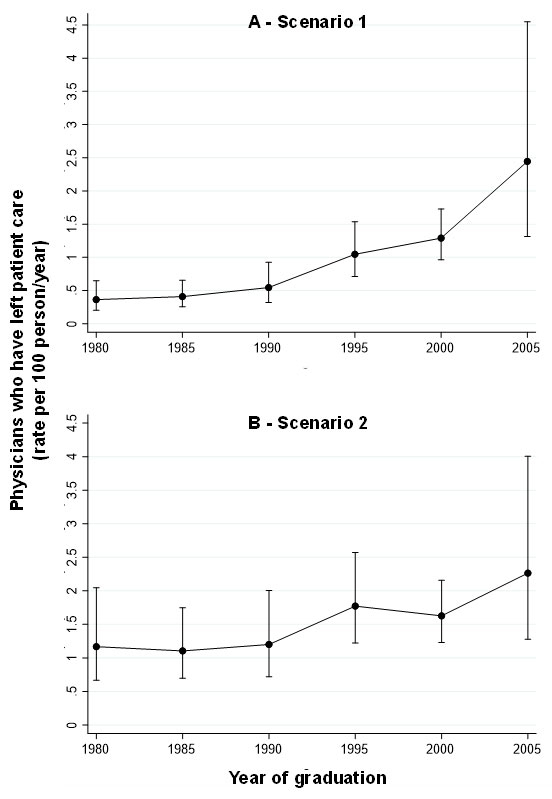 Figure 2 panel B shows the rate of physicians who left patient care based on scenario 2. In the period between 1980 and 2009, the rate of physicians who had left patient care was 1.5 per 100 physicians/year (95% CI 1.2–1.8). For physicians who graduated between 1980 and 1994 we estimated a rate of 1.2 per 100 physicians/year (95% CI 0.9–1.6); for those who graduated between 1995 and 2009, we estimated a rate of 1.8 per 100 physicians/year (95% CI 1.4–2.3).