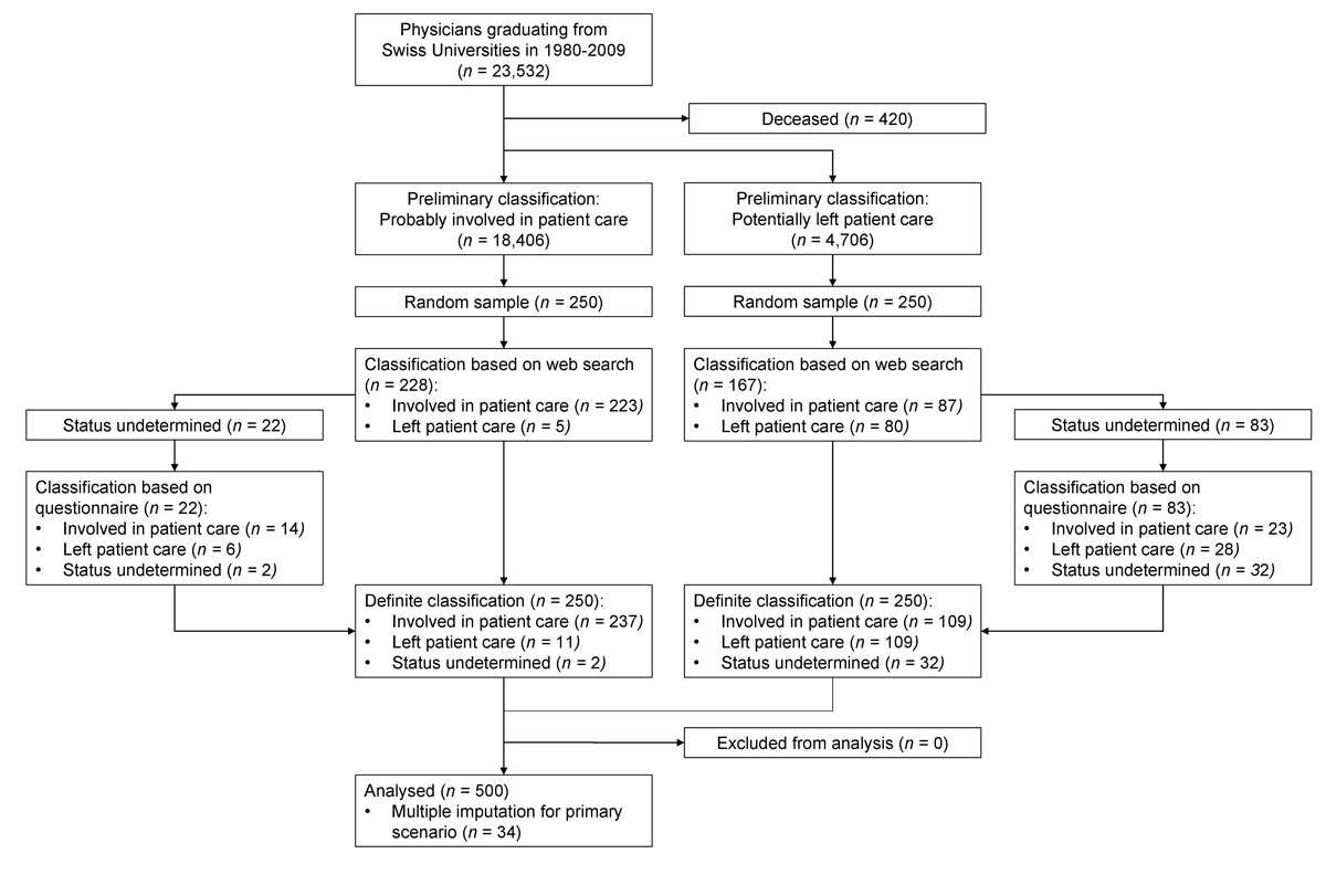 Between 15 July and 4 August 2015, one of us (SC), who was unaware of the preliminary classification, searched professional directories such as www.medreg.admin.ch, www.doktor.ch, and www.doctorfmh.ch, and social media websites such as www.linkedin.com, www.facebook.com, and www.google.ch to determine the working status of each physician. If a physician was clinically active (i.e. in direct contact with patients) in a private practice or hospital, we definitively classified them as involved in patient care whether or not they were board certified. If a web search uncovered a current description of professional activity that ruled out involvement in patient care, we definitely classified the individual as having left patient care. If we could not make a definitive determination we classified the status of the physician as undetermined. Between 10 and 23 August 2015, physicians whose status was undetermined and who had a known email or postal address were invited to complete an online questionnaire about their working status in German or French. All non-responders were sent a reminder letter by postal mail a week after the initial invitation; this letter included a postal questionnaire.