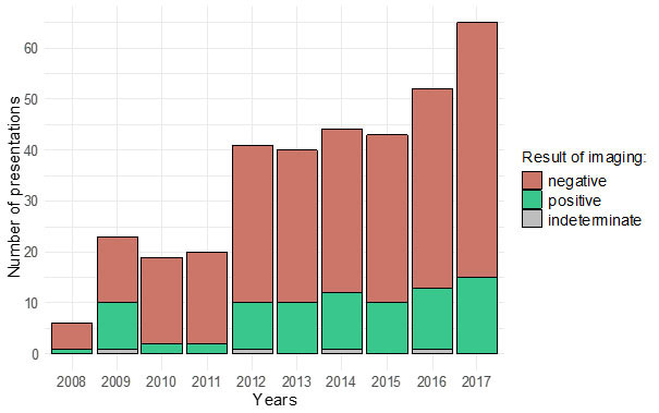 Figure 2 Results of imaging in presentations with suspicion of intracorporeal drug transport for the years 2008 to 2017.