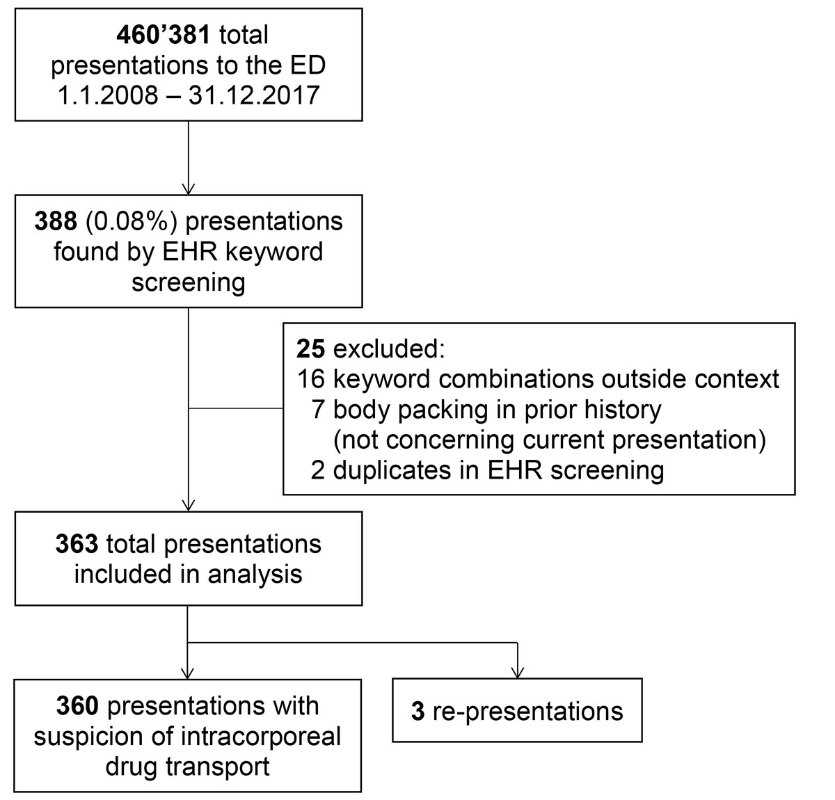 To find every suspect referred to our ED over a period of 10 years, diagnosis and history of presenting complaints of EHRs were screened for combinations of keywords “body”, “pack”, “stuff” and “push”, between 1 January 2008 and 31 December 2017. Subsequently, duplicates in EHR screening, keyword combinations outside of the context of drug transport, and cases with intracorporeal drug transport in the prior history not concerning the current presentations were excluded (fig. 1). Suspects were mostly referred by police of the Canton of Basel-City or Swiss border guards, including suspects arriving at the international airport EuroAirport Basel-Mulhouse-Freiburg.