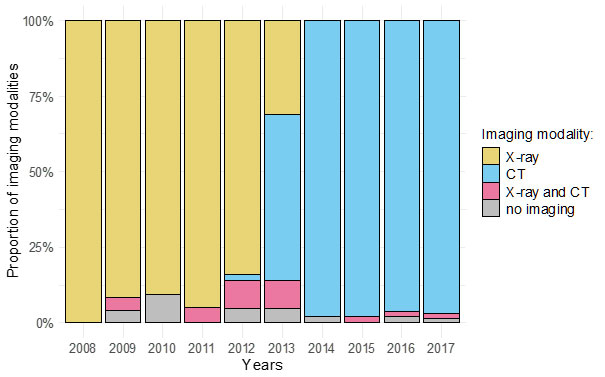 Figure 4 Imaging modalities in presentations with suspicion of intracorporeal drug transport for the years 2008 to 2017.