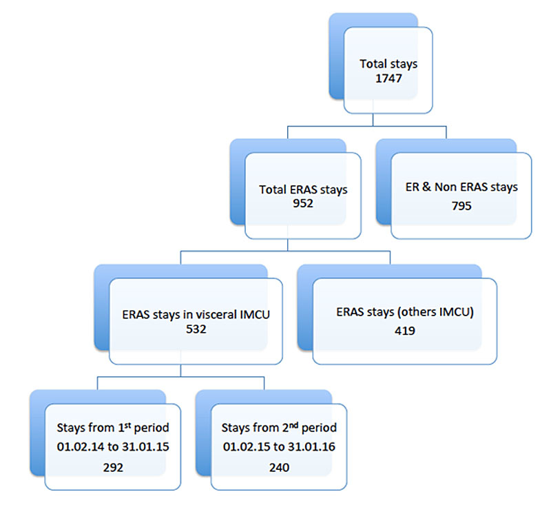 Some of the patients were prospectively included in ERAS programmes, and thus well documented in institutional databases. All patients who underwent elective or emergency upper gastrointestinal, liver, pancreas or colorectal surgery were included. This made a total of 1747 hospital stays; all of them included at least one stay in the IMCU. Of all IMCU stays, 952 were ERAS stays and 795 were non-ERAS stays (e.g., multiple organ failure, acute pancreatitis, abdominal abscess). Of the 952 ERAS stays, 532 were in the visceral surgery IMCU and the other 419 stays were admitted to other IMCUs where daily supervision by a CCS was not available. Of the 532 ERAS visceral surgery IMCU stays, there were 292 stays in the first period (before CCS implementation), and 240 stays in the second period (after CCS implementation). Figure 1 summarises the selection of the analysed population.