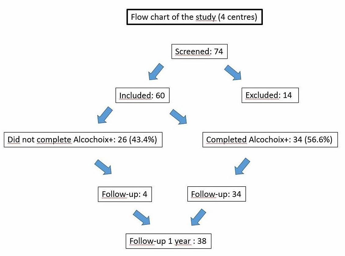 Four out of 12 centres (12 different providers of the programme) offering the Alcochoix+ programme in the French-speaking part of Switzerland included patients for the cohort, representing 12 providers. During the 17-month recruitment period, only 74 patients were screened and 60 included (refusal rate 19%). The flow chart of the study is presented in figure 1.