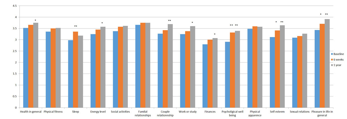 Figure 3 Quality of life at baseline and follow up. * p <0.05; ** p <0.01