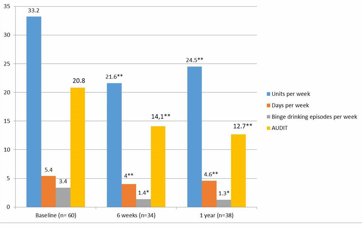 For the 34 participants who completed the programme, alcohol consumption was lower after 1 year of follow-up, with 20.4 drinks per week (p <0.001), a frequency at 4.1 days a week (p <0.001) and quantity of 4.6 drinks per day (p = 0.01). The number of heavy drinking episodes was evaluated by participants at 1.2 episodes per week (p = 0.003).