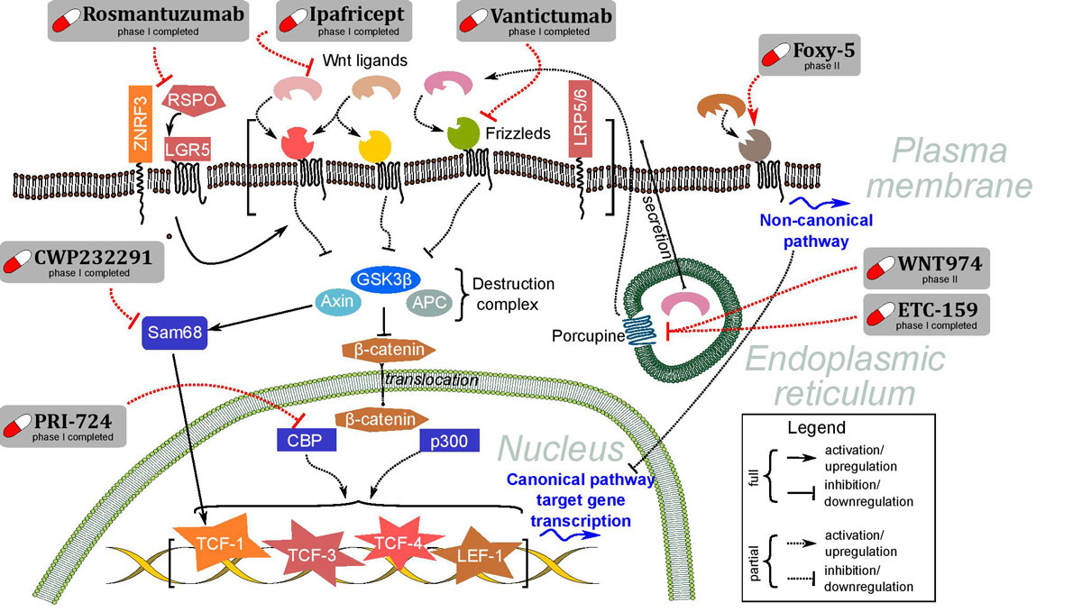 Figure 1 Drug compounds of past or current clinical trials target the Wnt pathway at the ligand/receptor level (rosmantuzumab, ipafricept, vantictumab and Foxy-5) or at the transcriptional level (CWP232291 and PRI-724). Porcupine inhibitors (WNT974 and ETC-159) target Wnt secretion.