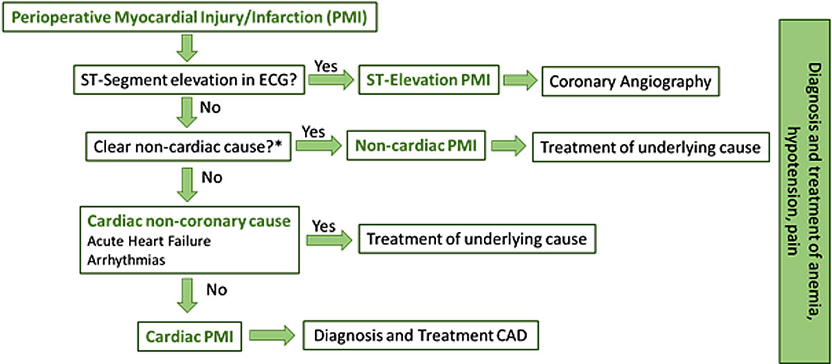 As with spontaneous myocardial infarction, different pathophysiological processes may underlie the development of PMI [59, 77]. Type 1 myocardial infarction (atherosclerotic plaque rupture and/or erosion) and type 2 myocardial infarction (supply-demand mismatch of oxygen) seem to be the most common, but several other cardiac and even primarily noncardiac conditions may contribute to myocardial injury and therefore to the differential diagnosis of PMI (table 1). Therefore, the approach to patients with PMI should be personalised, with a careful clinical evaluation, including an ECG, with the aim to identify and treat the most likely mechanism (fig. 3). In the presence of ST-segment-elevation myocardial infarction (a rare event in the perioperative period), this should be treated as usual with primary percutaneous coronary intervention. As these patients are at increased bleeding risk, dual antiplatelet therapy with clopidogrel rather than more potent antiplatelet agents should be preferred. The next step is to exclude a primarily noncardiac cause, such as severe sepsis, stroke, cardiac trauma or pulmonary embolism [78]. In the presence of a primarily noncardiac cause, the specific condition should be treated. Then a cardiac but non-coronary cause, such as acute heart failure or arrhythmias, should be identified and treated according to current guidelines [79]. Potential causes for type 2 myocardial infarction, such as anaemia, tachycardia due to pain and hypotension should always be assessed and treated accordingly. For the remaining patients, diagnosis and treatment of coronary artery disease should be performed. The recommendation and timing for invasive or noninvasive diagnosis depends on patient characteristics, clinical presentation and ECG findings, and should be individualised [68, 80]. The Basel-PMI study revealed that the vast majority of cases of PMI (86%) are cardiac and about 14% have a primarily noncardiac trigger [58].