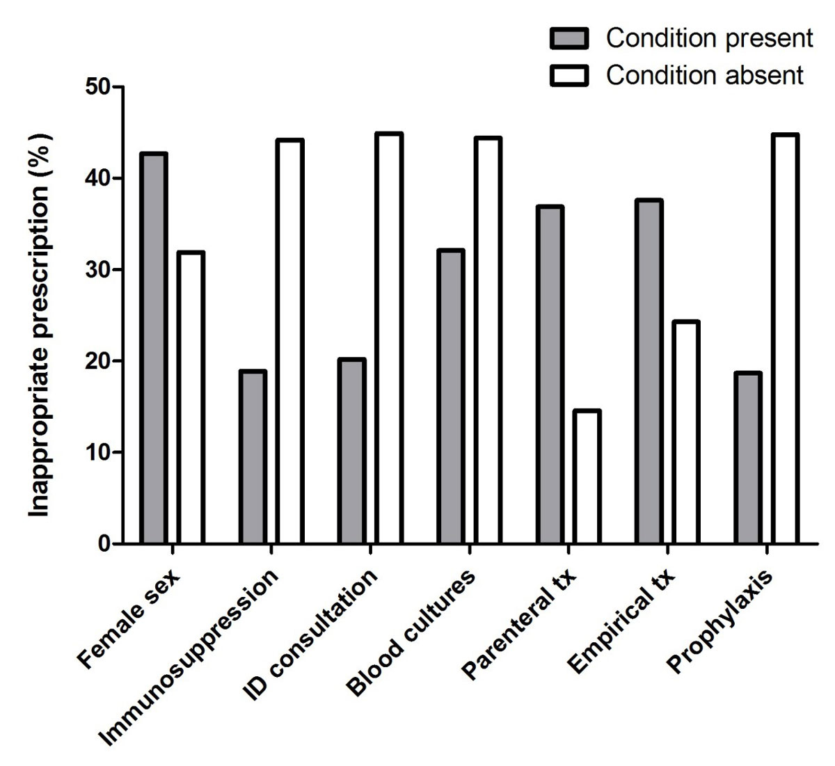 Figure 1 Inappropriateness of antimicrobial prescriptions according to the presence or absence of patient characteristics (n = 378; female vs male sex; immunosuppression) and prescribing characteristics (n = 548; parenteral vs oral and empirical vs targeted/prophylactic treatment; prophylaxis vs other indications for antimicrobials) or procedures (n = 378; infectious diseases (ID) consultation or blood culture sampling prior to antimicrobial treatment).