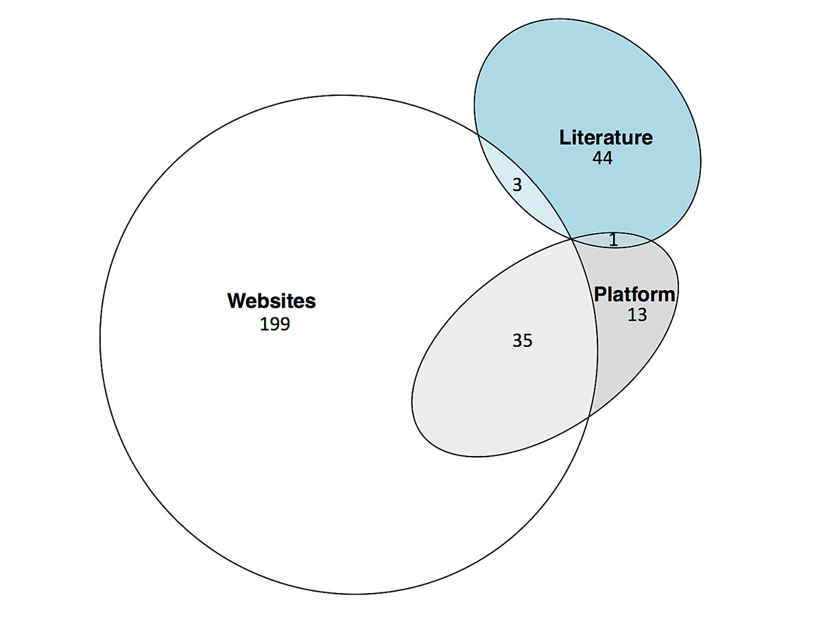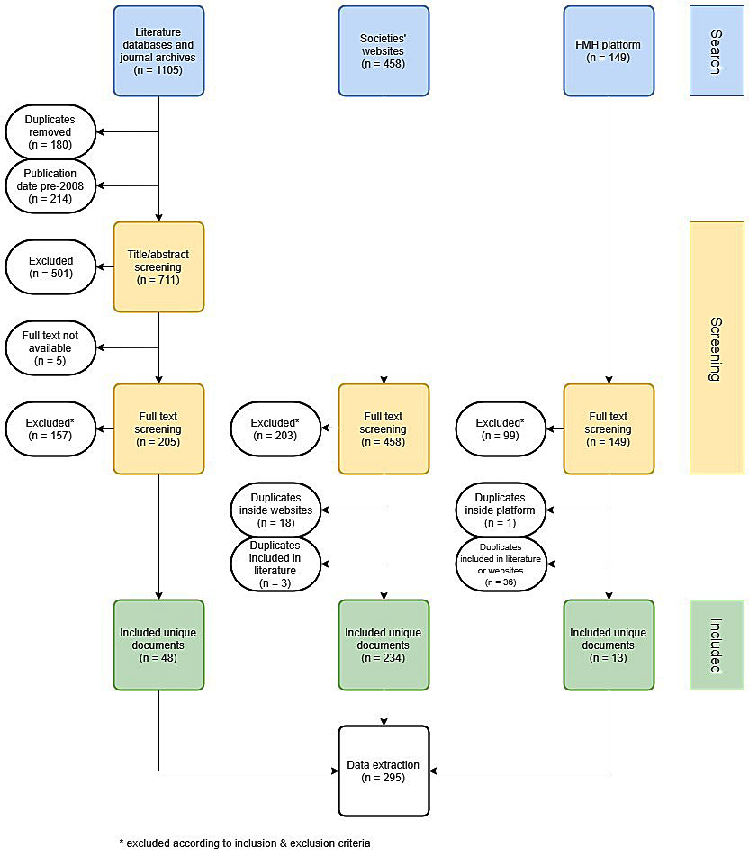 Literature – scientific literature databases and archives of two major non-indexed Swiss medical journals, Platform – FMH guidelines platform guidelines.fmh.ch, Websites – Swiss medical societies’ websites.