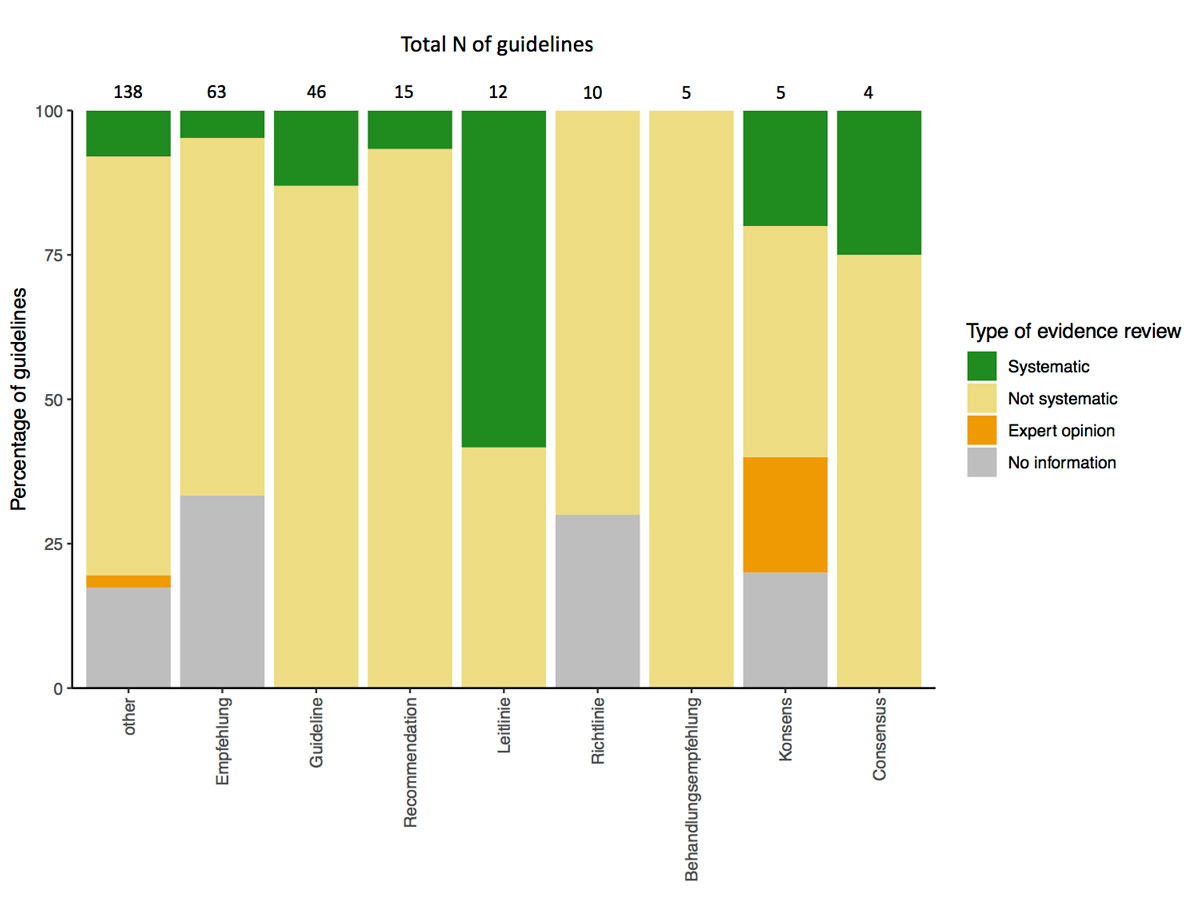 Keywords in the title were associated with different frequencies of using the methodology of a systematic review (fig. 3). A systematic review was performed in CPGs titled “Leitlinie” most frequently (58% of “Leitlinie”). Country of origin was also associated with the type of evidence review (fig. 4). Guidelines developed in Switzerland (without international cooperation) reported a systematic review of evidence least frequently (2%), and it was more prevalent with an international cooperation between Switzerland, Germany and Austria or other countries (fig. 4).