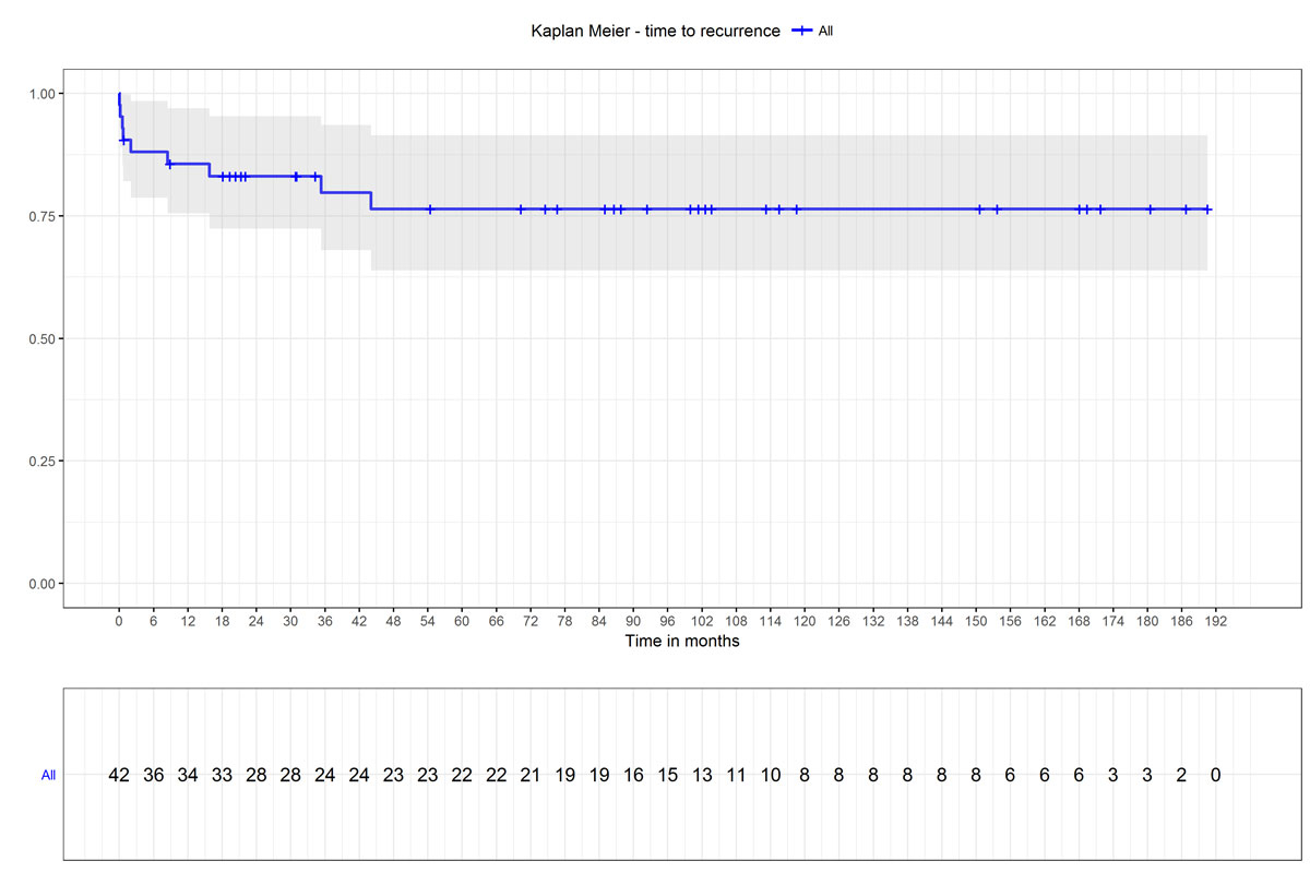 As shown in the Kaplan-Meier plot (fig. 1), the probability of remaining recurrence-free for six months was 0.88 (95% confidence interval [CI] 0.79–0.98); for one year, 0.86 (95% CI 0.76–0.97); and for five years, 0.76 (95% CI 0.64–0.92).
