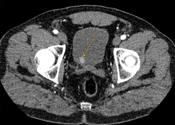 Figure 4 Axial CT scan of a bladder tumour incidentally diagnosed in a 62-year old ED patient with a history of cigarette smoking and cerebrovascular disease.