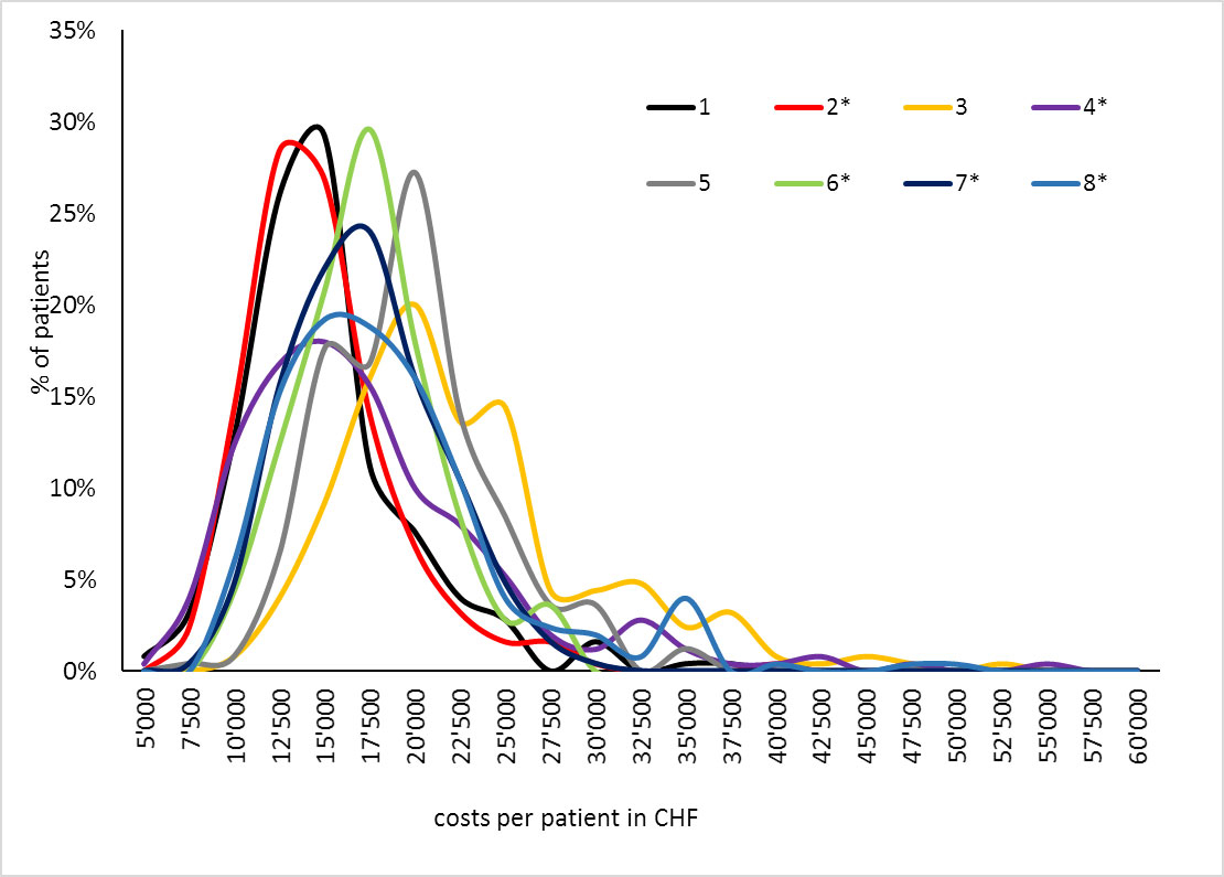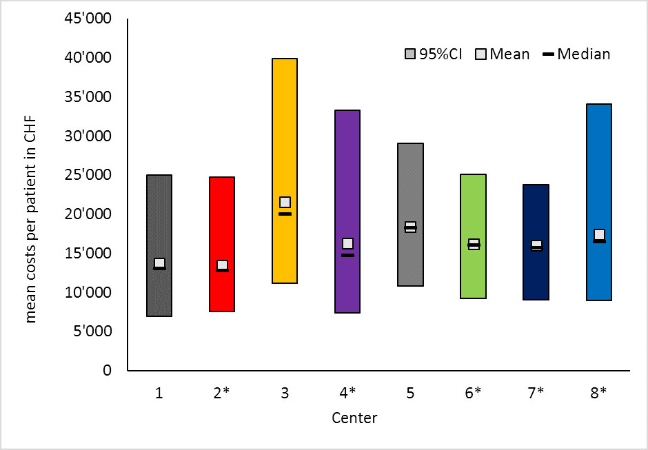 In the base case analysis, mean costs per patient were distributed over a range from CHF 13,748 to CHF 22,072, being the lowest in centre 2 (CHF 13,748, 95% confidence interval [CI] 9868–17,089) and the highest in centre 3 (CHF 22,072, 95% CI 21,414–22,639), which is 1.6 times higher than in centre 2 (table 2).