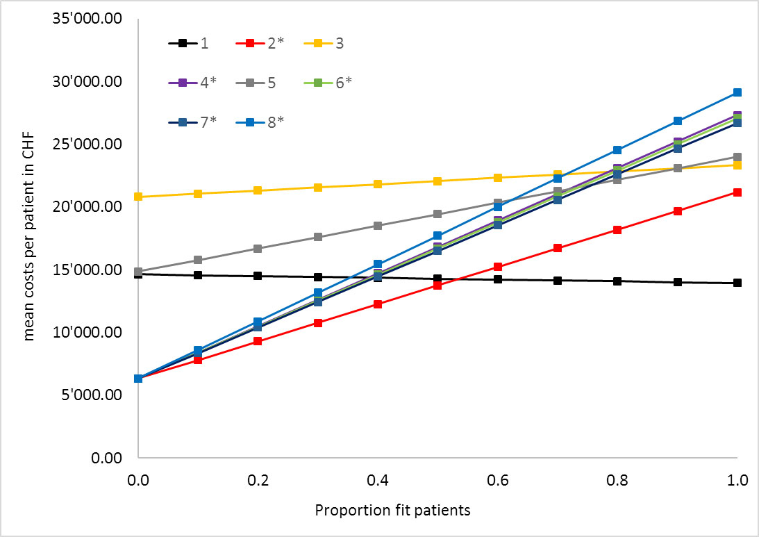 Figure 1 One-way sensitivity analysis expected base case mean costs per patient and centre by proportion of fit patients.