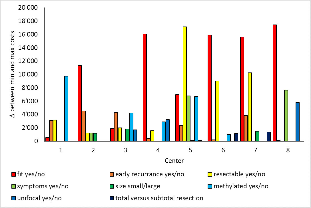 Although there are very limited comparative outcome data for the available therapies in recurrent GBM [6], we found considerable cost differences among these treatment options in Switzerland (see table 1). In the base case scenario, treatment costs varied between the centres by a factor of 1.6 from CHF 13,748 to CHF 22,072 (approximately USD 13,760 to 22,090 in May 2018) depending on the individual treatment algorithm.