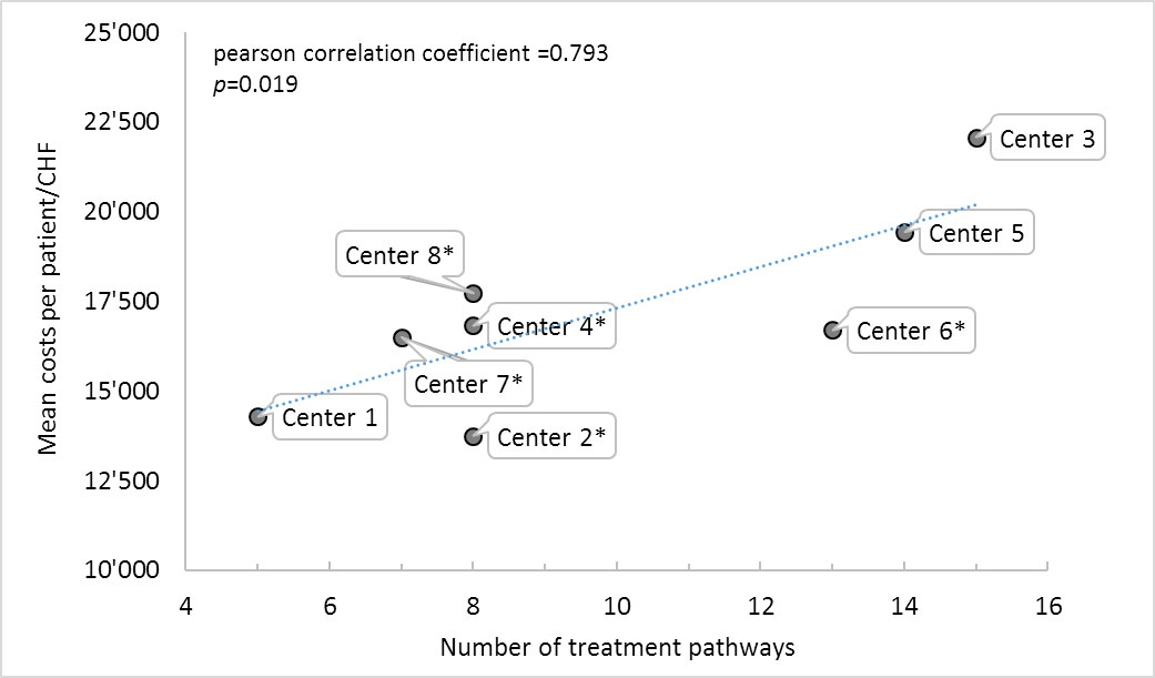 There was a significant correlation (R2 = 0.793, p = 0.019) between the number of different treatment options at a centre and the average treatment costs, meaning that the more complex the decision pathway and treatment options a centre provided, the more costly the average treatment was (see supplementary fig. S1 in appendix 1).