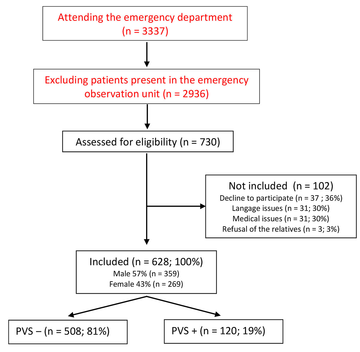 Variable | All patients (n = 628) | PVS+ (n = 120) | PVS− (n = 508) | p-values* | |